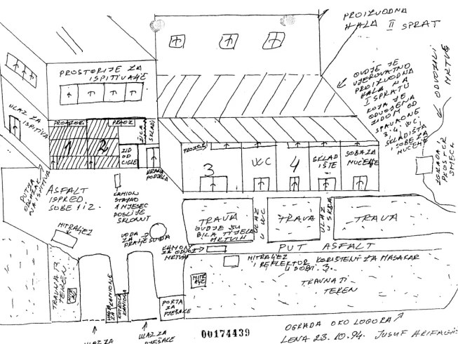 Denne skitse blev tegnet af vidnet for anklagemyndigheden, Jusuf Arifagić, der var interneret i Keraterm-lejren i Prijedor, Bosnien-Hercegovina, om sommeren 1992.